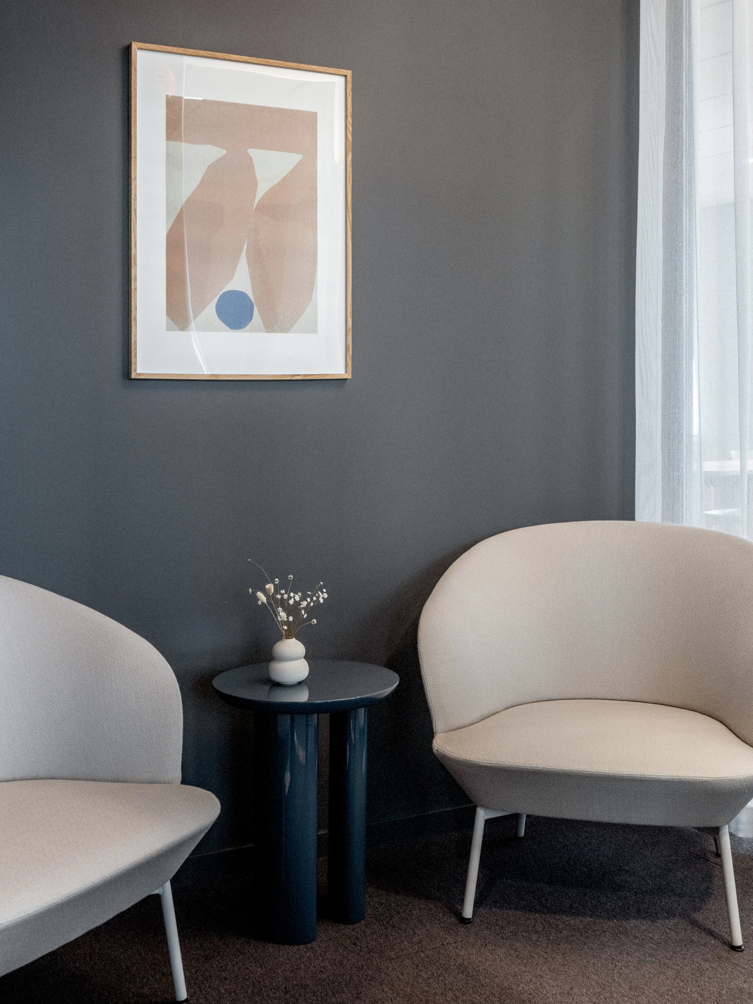 The office can be seen as calm through the muted tones but is complemented by interesting geometric shapes, large green plants and playful touches of varying blue tones that also contribute to a younger, modern impression.