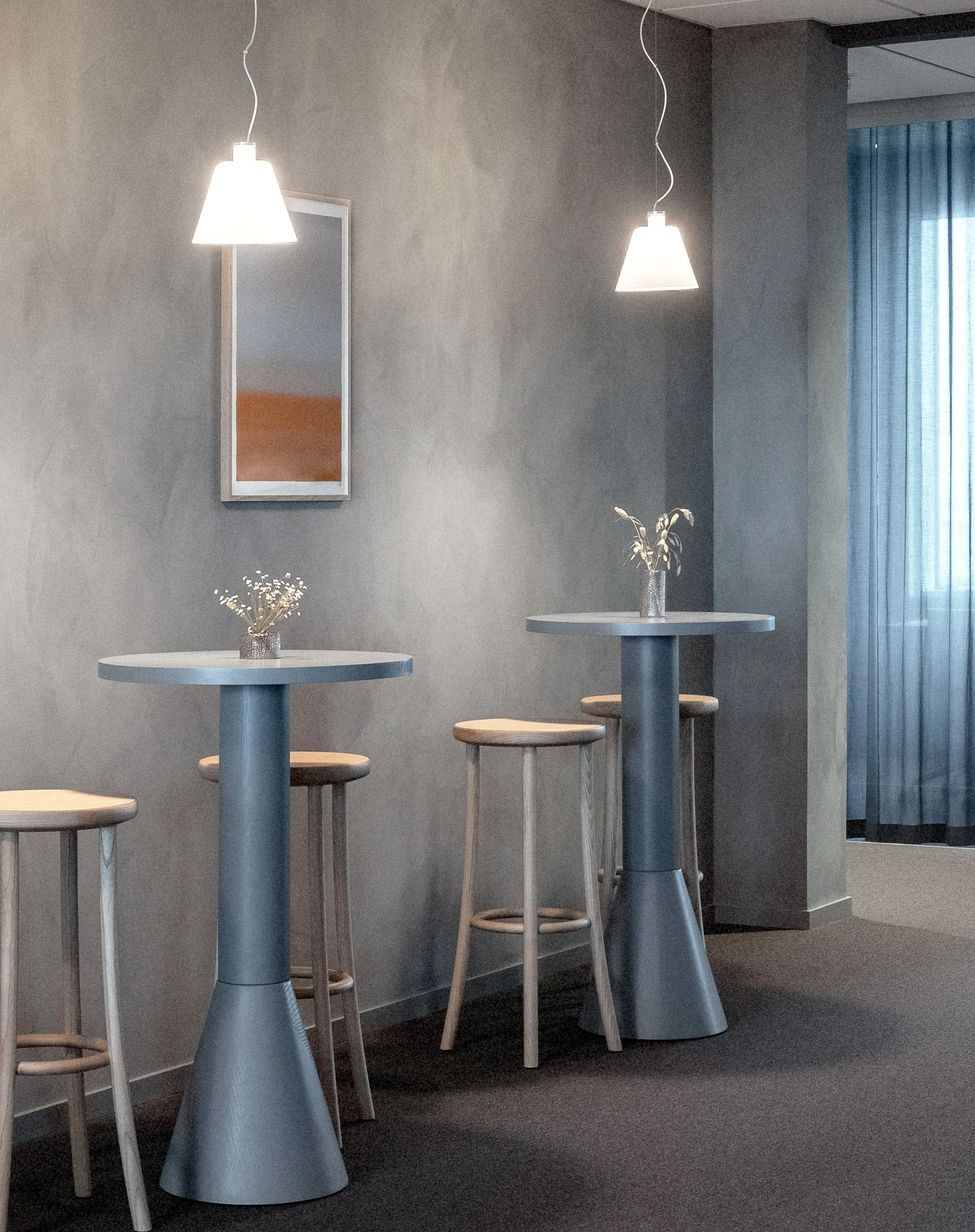 To maintain the feeling of the original concrete structure in the building’s core, the walls have been painted with grey lime plaster and the kitchenette in a darker contrasting grey.