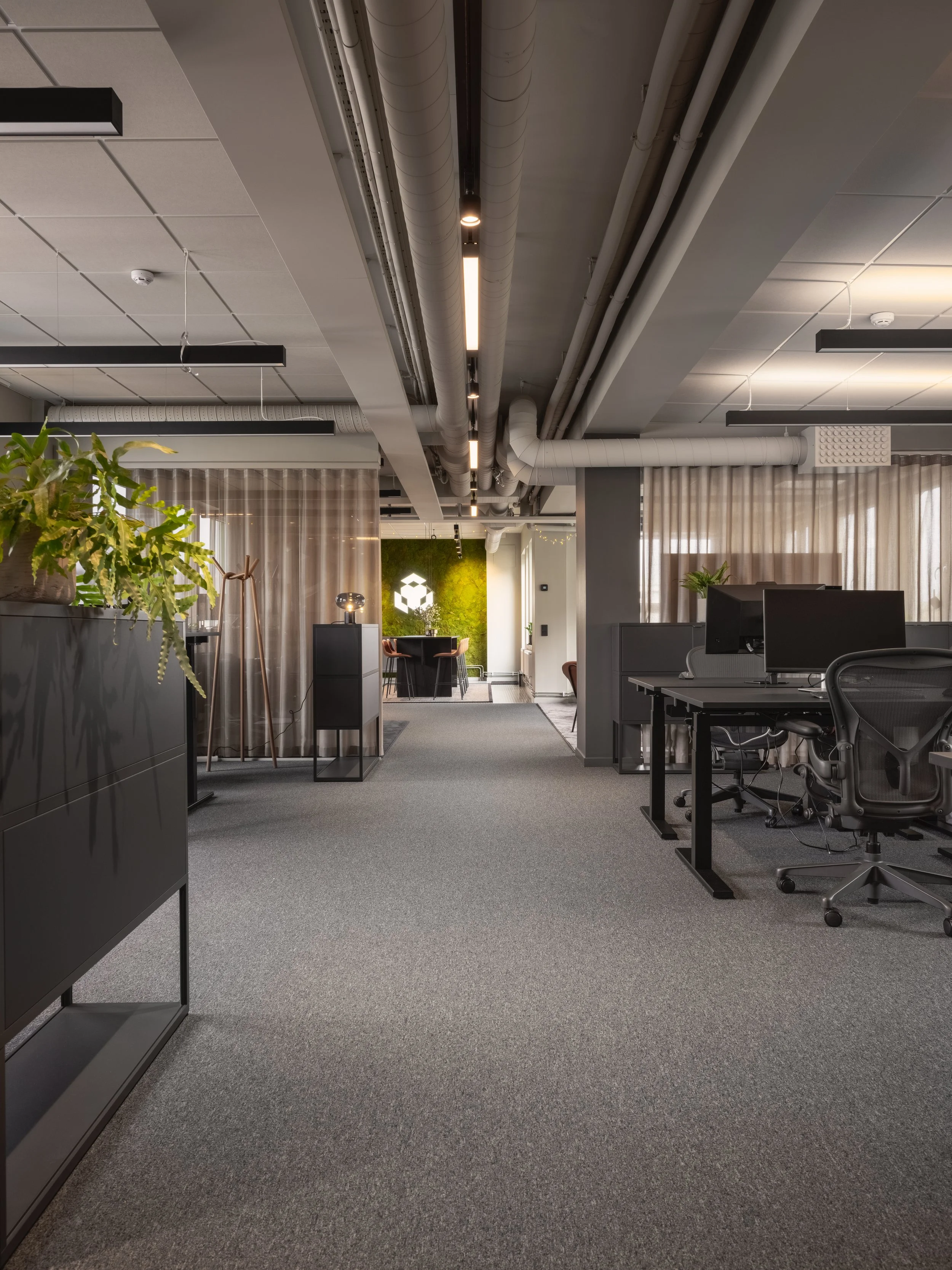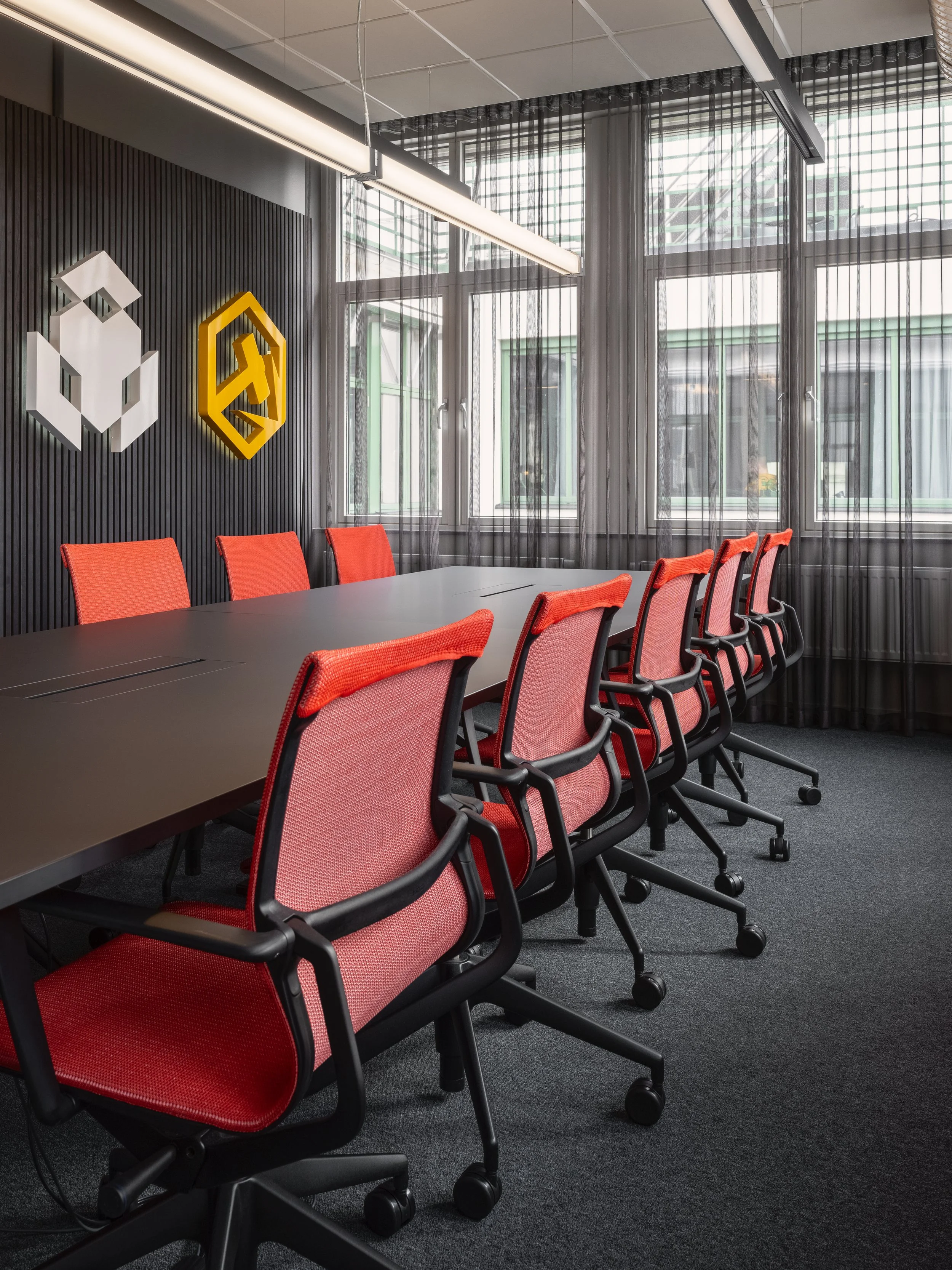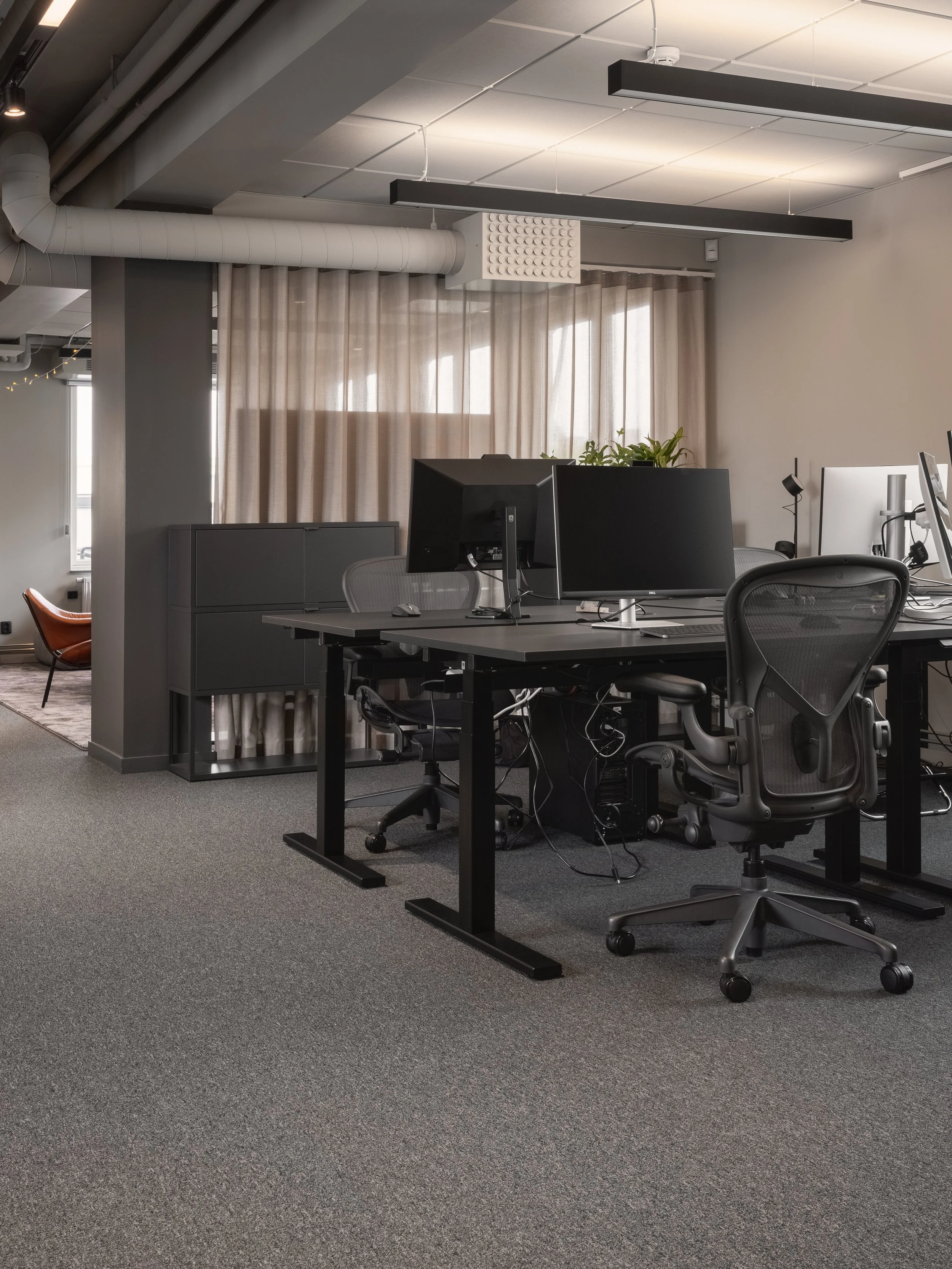 Högst upp bland hustaken, mitt i centrala Malmö, har spelstudion Tuxedo Labs sitt nyrenoverade kontor. Det behöver inte alltid vara snabba neonljus och starka färger på agendan, här har dessa element lämnats kvar i videospelen, och istället ligger fokus på en tydlig och lugnande gråskala IRL. För att skapa en harmonisk och varm känsla kombineras gråskalan med mjuka material, konjaksfärgat läder och gröna inslag. Konferensrummet stjäl kanske lite av uppmärksamheten med sina klarröda stolar, vilket skapar en spännande kontrast—något som påminner om sekvenser från spelet Teardown, en given inspirationskälla.