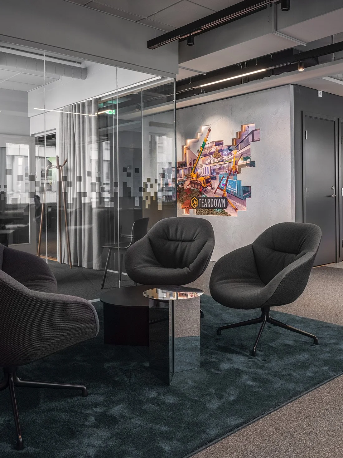 Teardowns inflytande märks i olika delar av kontorets inredning. För ett tränat öga kan man urskilja voxlar (det vill säga tredimensionella pixlar) i mönstret på frosten på alla glaspartier, medan spelet lyfts fram i hjärtat av kontoret genom en unik "Teardown-vägg" som, förstås, är nedriven med synliga voxlar. Game on!