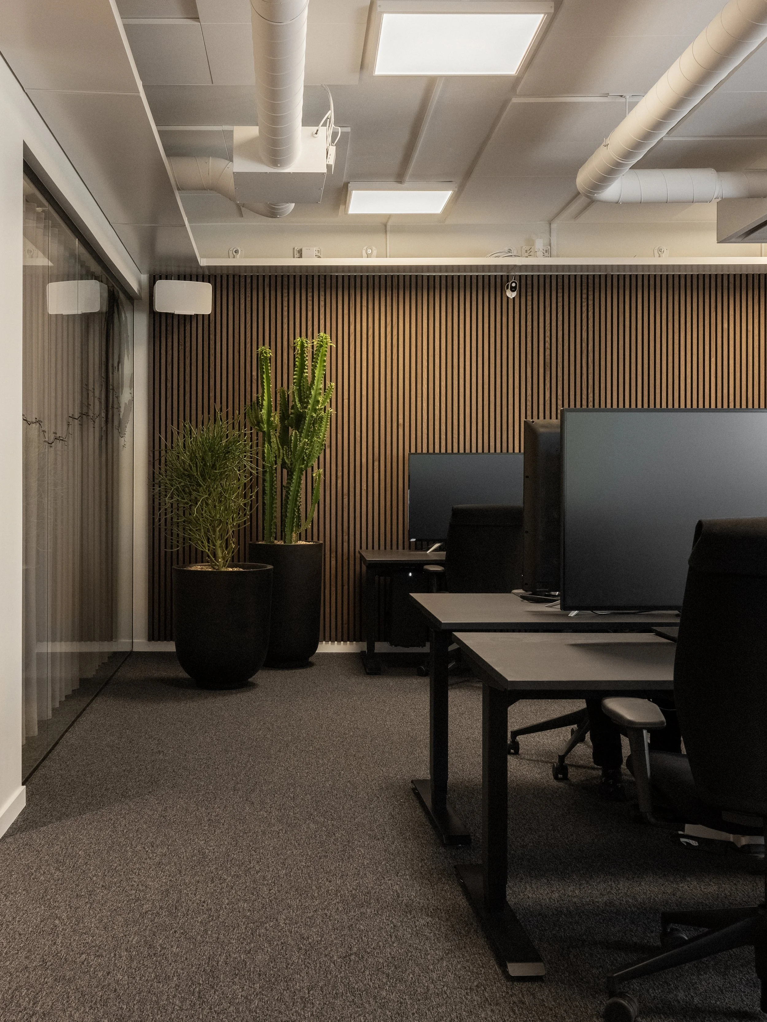 I de gemensamma utrymmena kombineras olika typer av trä och cognacsläder med grova sisalmattor och mörka ytor. Här möts väst och Skandinavien, de skarpa kontrasterna bidrar till en dynamisk atmosfär där både sociala och fokuserade aktiviteter kan äga rum. I hjärtat av lokalerna finns ett rymligt kök med svartbetsade träytor och detaljer i läder och blank metall. På arbetsplatserna och i mötesrummen möts man av minimalistiska miljöer med lugna material som bjuder in till fokuserat arbete.